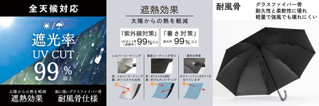 ■遮熱効果/UVカット率99%以上/遮光率99%以上/全天候対応/耐風骨仕様(※自動開閉傘を除く)