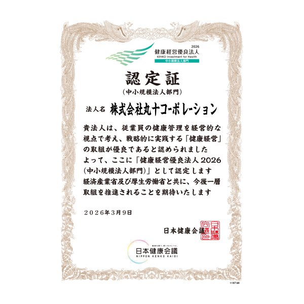 この度、株式会社 丸十コーポレーションは、経済産業省と日本健康会議が主催する健康経営優良法人認定制度より、「健康経営優良法人 2026(中小規模法人部門)」に6年連続で認定されました。